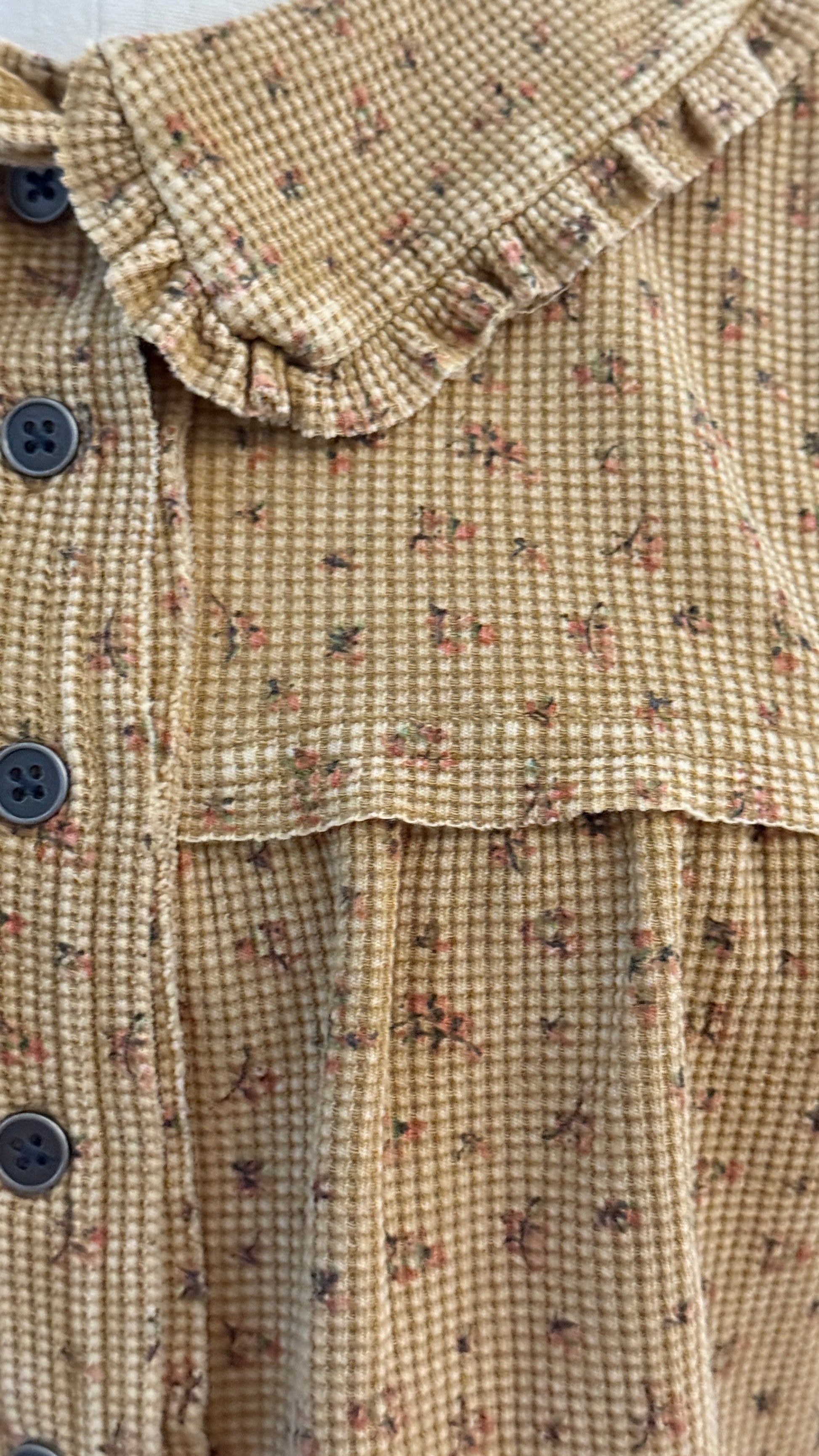 Camiseta térmica color caramelo con estampado floral, marca Easel, con botones hasta la mitad y cuello peregrino con volantes.