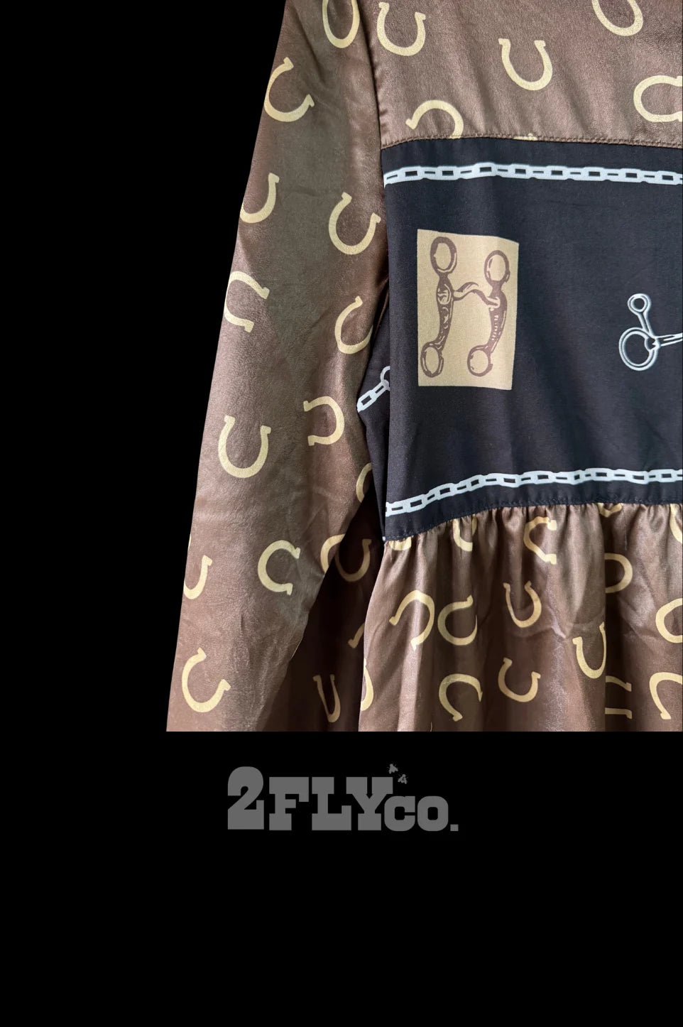 Horseshoes, chains, bits... OH MY this beautiful silky-type feel dress is a STATEMENT! Can be dressy or you can casual-it-down! Snap closures beautiful chocolate brown with black band 100% polyester.. it is a flowy dress fit with not alot of stretch due to the fabric