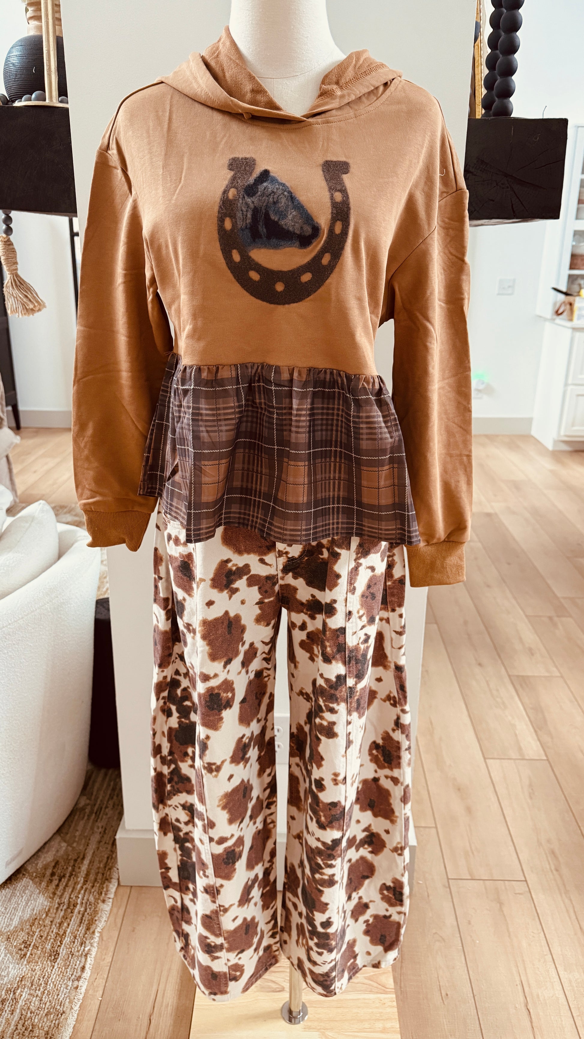 top half SUPER comfy hoodie material with a angus graphic. bottom half a cotton feel printed flowy material.