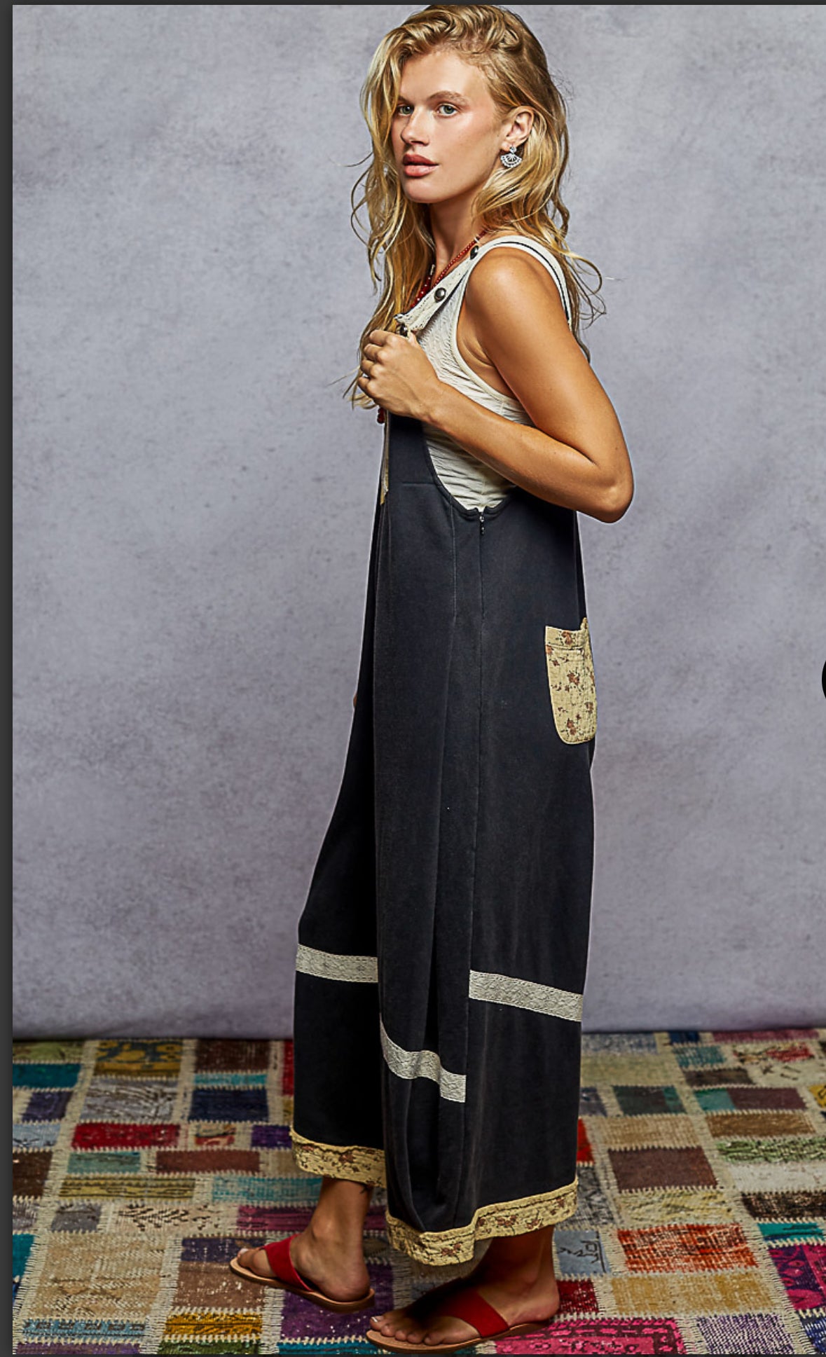 Black super soft overalls with patchwork and adjustable straps... slightly oversized fit