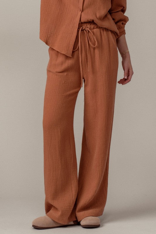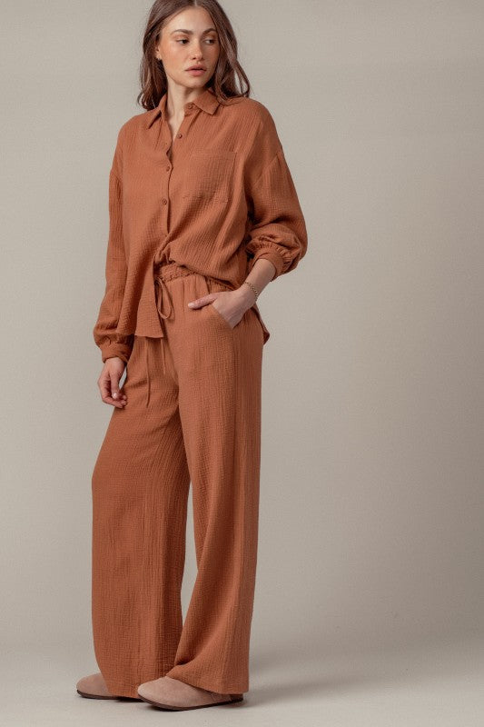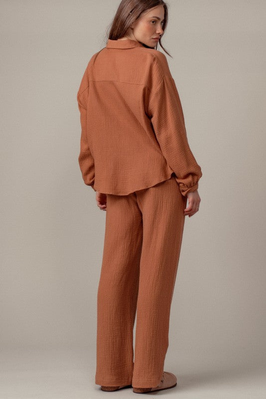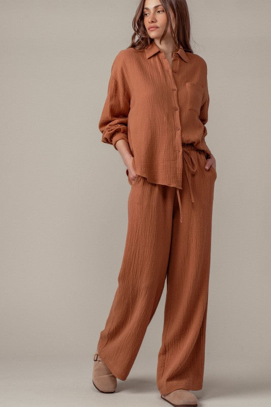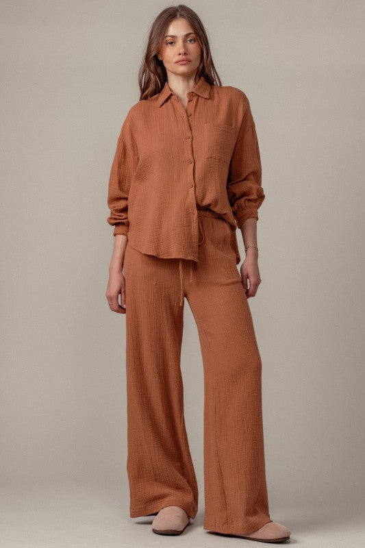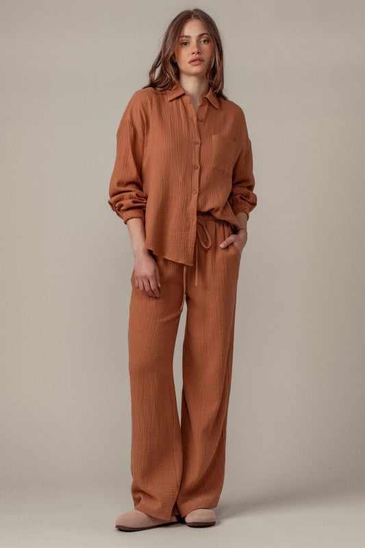 This cozy set features a relaxed top and wide leg pants, perfect for effortless style and comfort it is soft breathable cotton gauze fabric with a textured finish. includes a button up top and drawstring pants for a boho inspired look. the fit is loose and relaxed with adjustable drawstring waist for comfort 100% cotton Pairs perfectly with our striped mockneck !